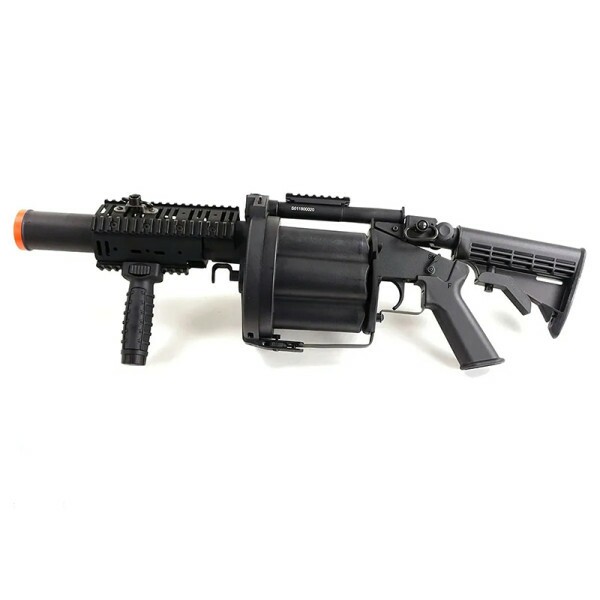 Tem capacidade para 6 granadas de 40 mm green gas (não inclusas) e front grip ajustável em 3 ângulos para seu melhor conforto e adaptação. Trilho ris superior 20 mm.