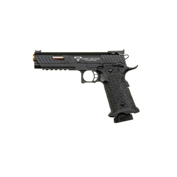 Entretanto essa GBB é uma réplica fiel e totalmente licenciada, projetada para ser uma pistola de alto desempenho. A pistola apresenta acessórios notáveis, como uma garra pontilhada e um alargamento magwell, igual no filme de John Wick. Assim a fibra verde frontal é oi-viz e fácil de pegar, mesmo com seu ciclo rápido.
