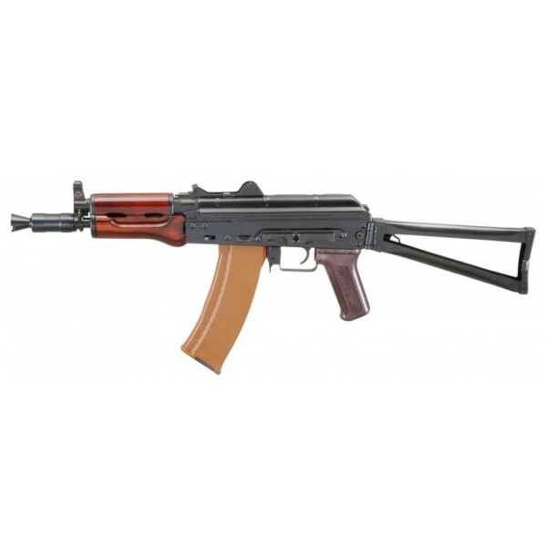 - Um receptor de aço estampado replica a aparência de um rifle real do tipo AK